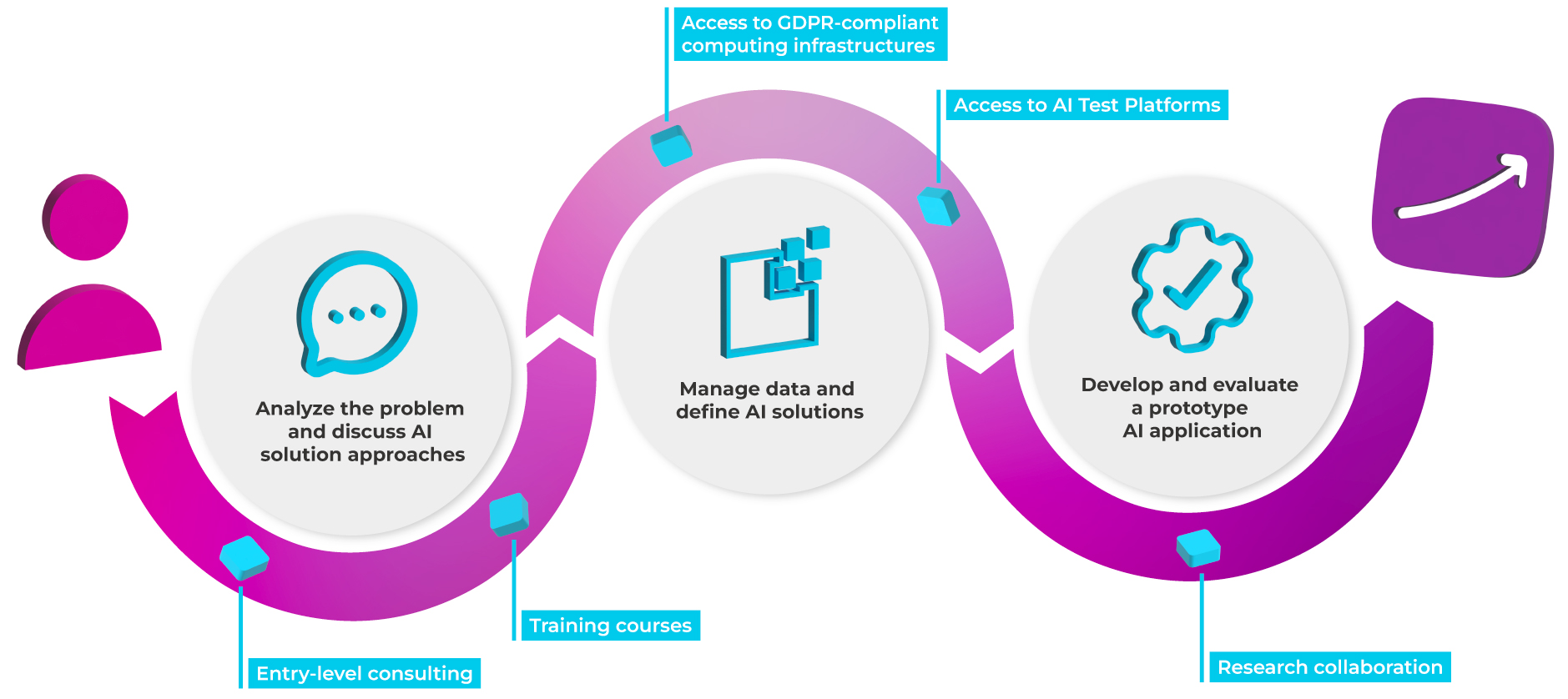 We are your contact for applied AI and offer you a range of Services for the implementation of your AI idea. These include access to AI computing resources and AI models, exploratory AI consulting, collaboration as part of a research partnership, training and education as well as straightforward testing of AI models in the AI.Lab(Experiment Space).